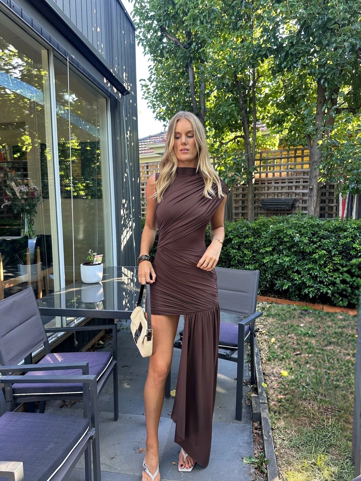 A striking asymmetric mini dress designed to sculpt the silhouette with sleek ruching and a refined high neckline. The sleeveless cut keeps the look modern and confident, while the fitted shape flatters beautifully from every angle. Perfect for parties, evening events, and upscale gatherings, this dress delivers effortless glamour with a timeless edge.